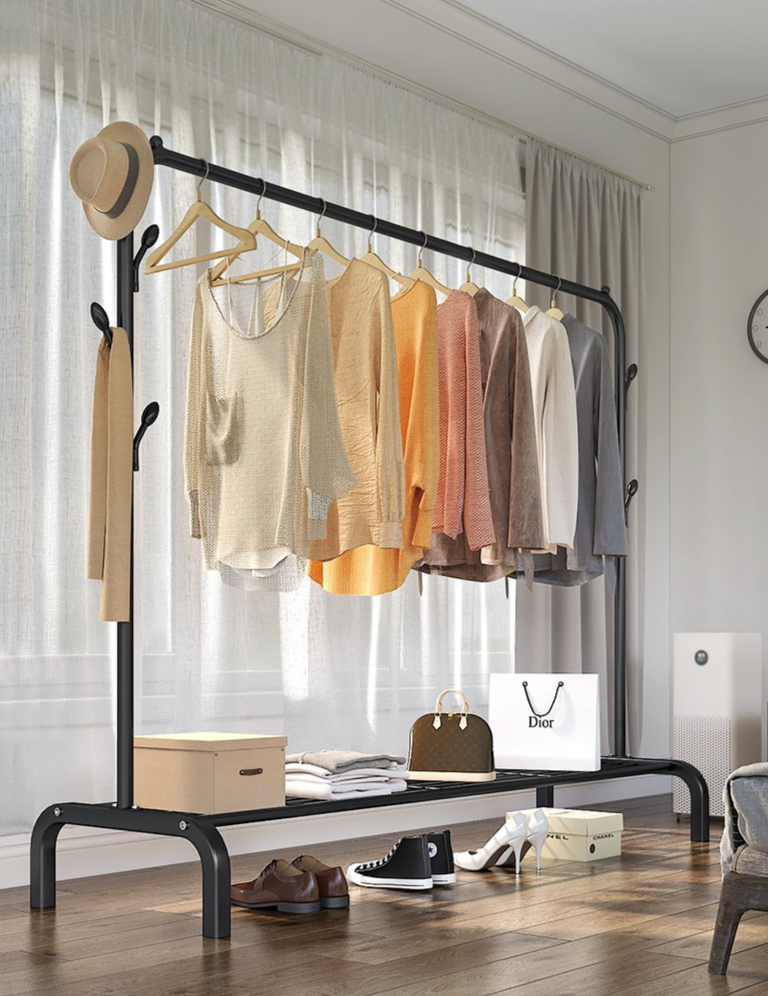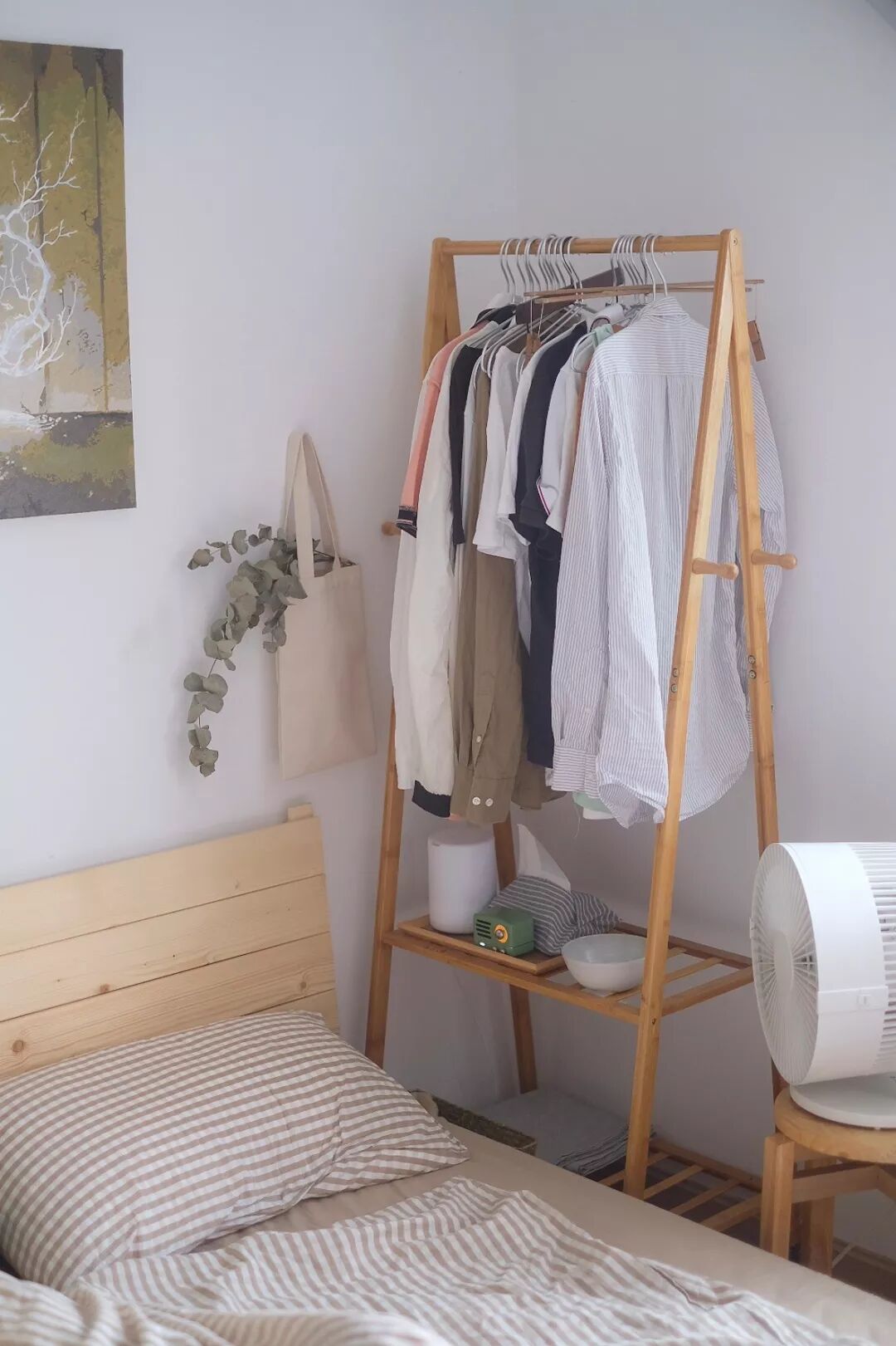 卧室如果衣服实在太多,可以买下面这种晾衣架,上面挂衣服下面可以放鞋子和收纳箱,旁边还可以挂包包,承重能力强,既方便又实用。▼