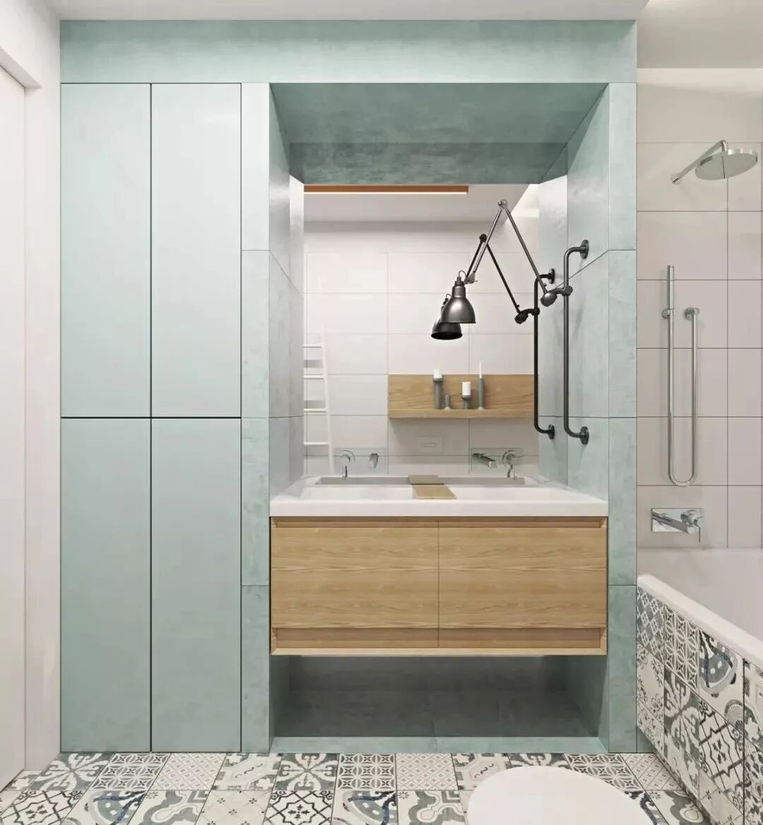 卧室的梳妆台可以直接移到卫生间来完成,洗漱之后顺便完成化妆。镜柜最上面到顶可以收纳不常用的洗漱用品,台面及下面部分收纳化妆品或洗漱用具等,早上在这里洗漱、化妆一气呵成,洗漱完出来就美美哒,梳妆台完全可以省掉,一台两用,真香。▼