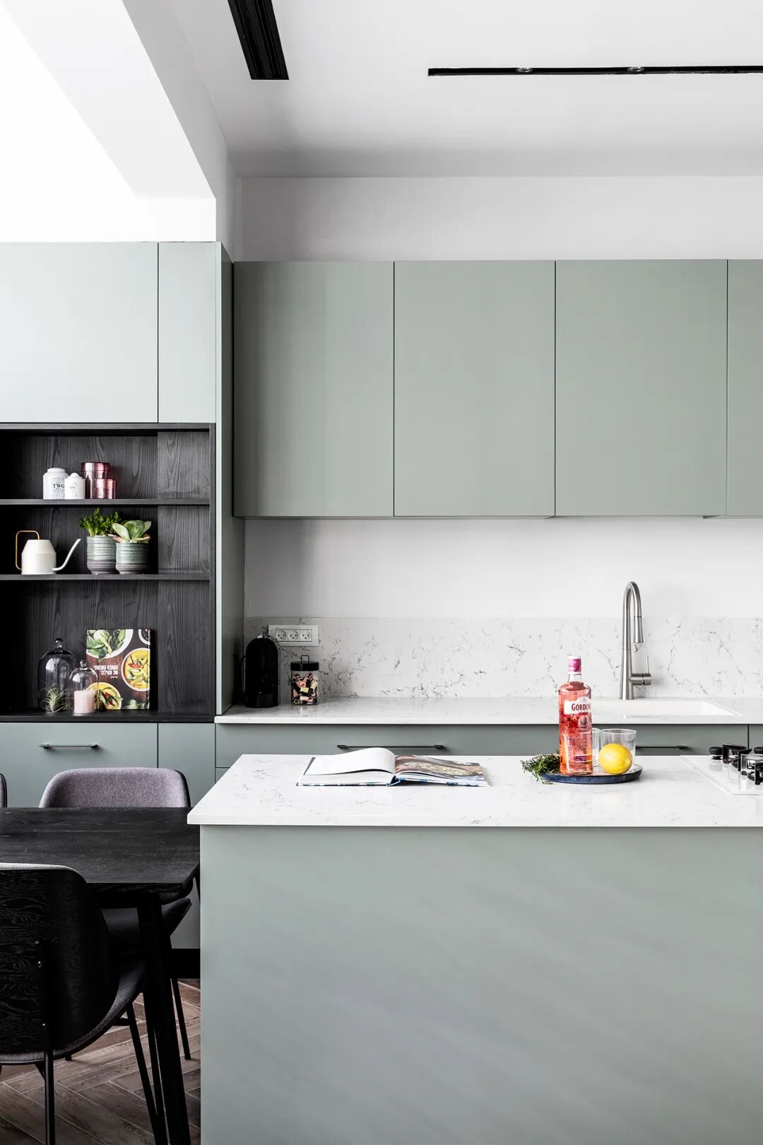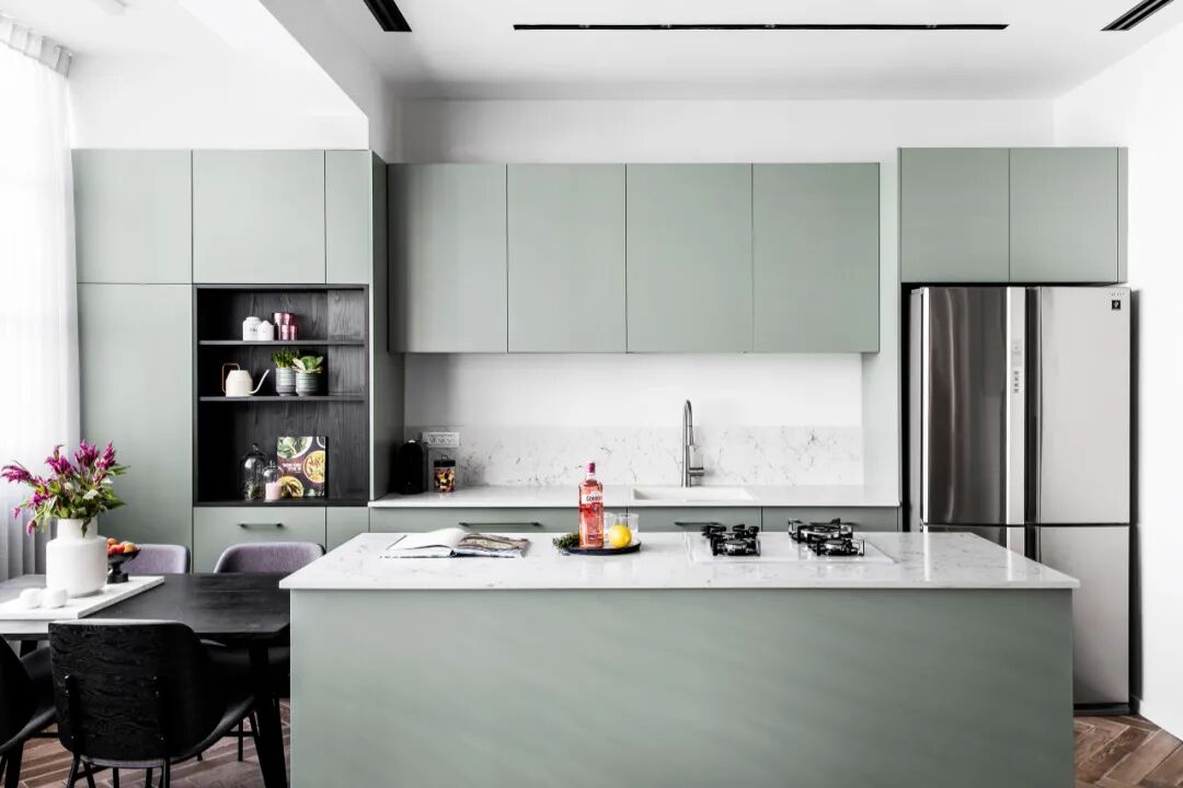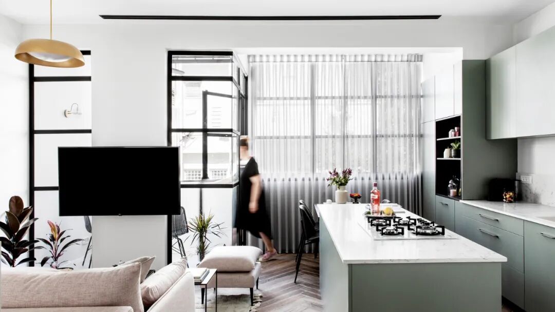 在开放式的生活空间中,一个时尚的厨房岛可以变成一张餐桌,从概念上将空间分为两个区域。