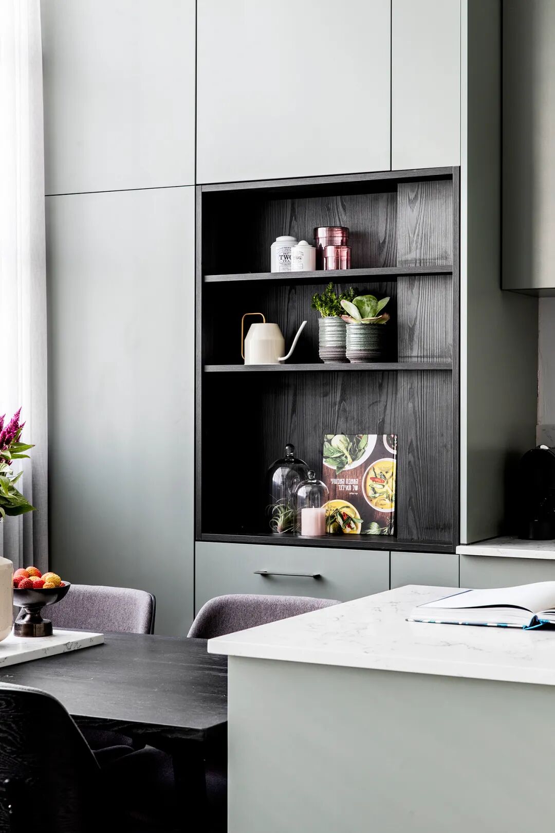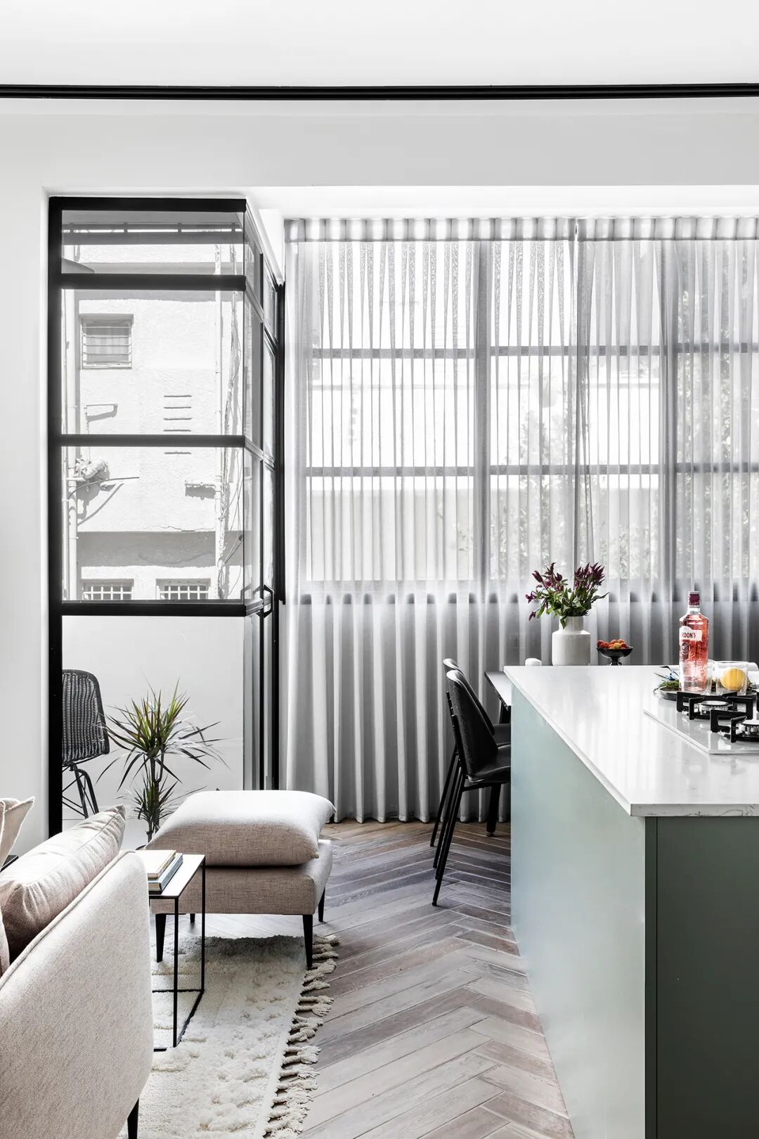 大刀阔斧的开窗为室内引入了更多的阳光。打通了原本的阳台,设计师在原来的厨房岛台边放上了一张餐桌,并且预留了婴儿椅的位置。