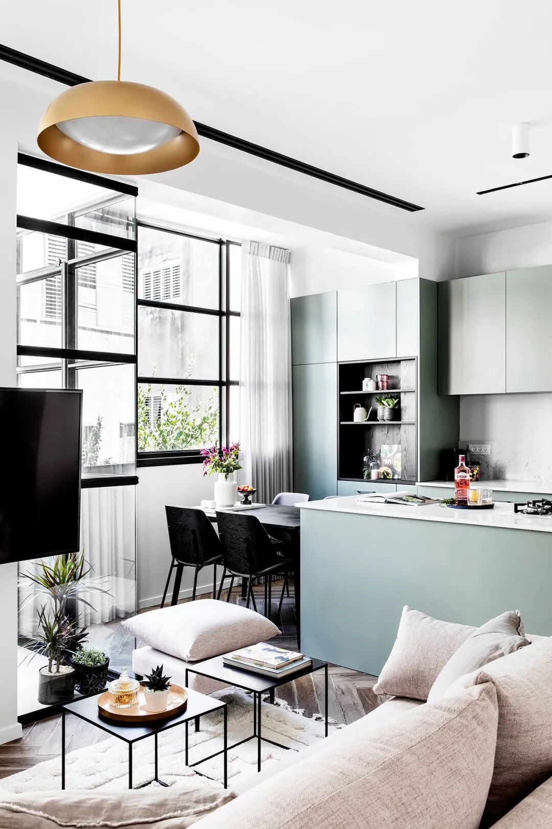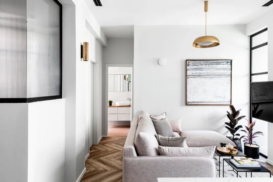 在当代简约主义美学和注重功能性的基础上,不加修饰的室内设计使公寓充满了宽敞和舒适感。清爽的糖果色又为整个空间增添了生气。