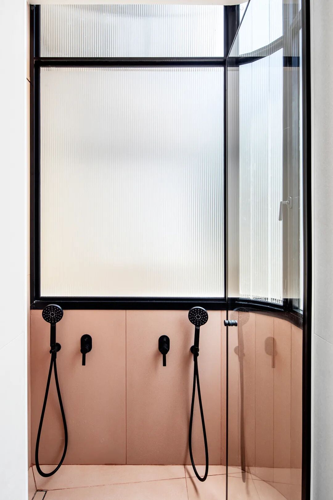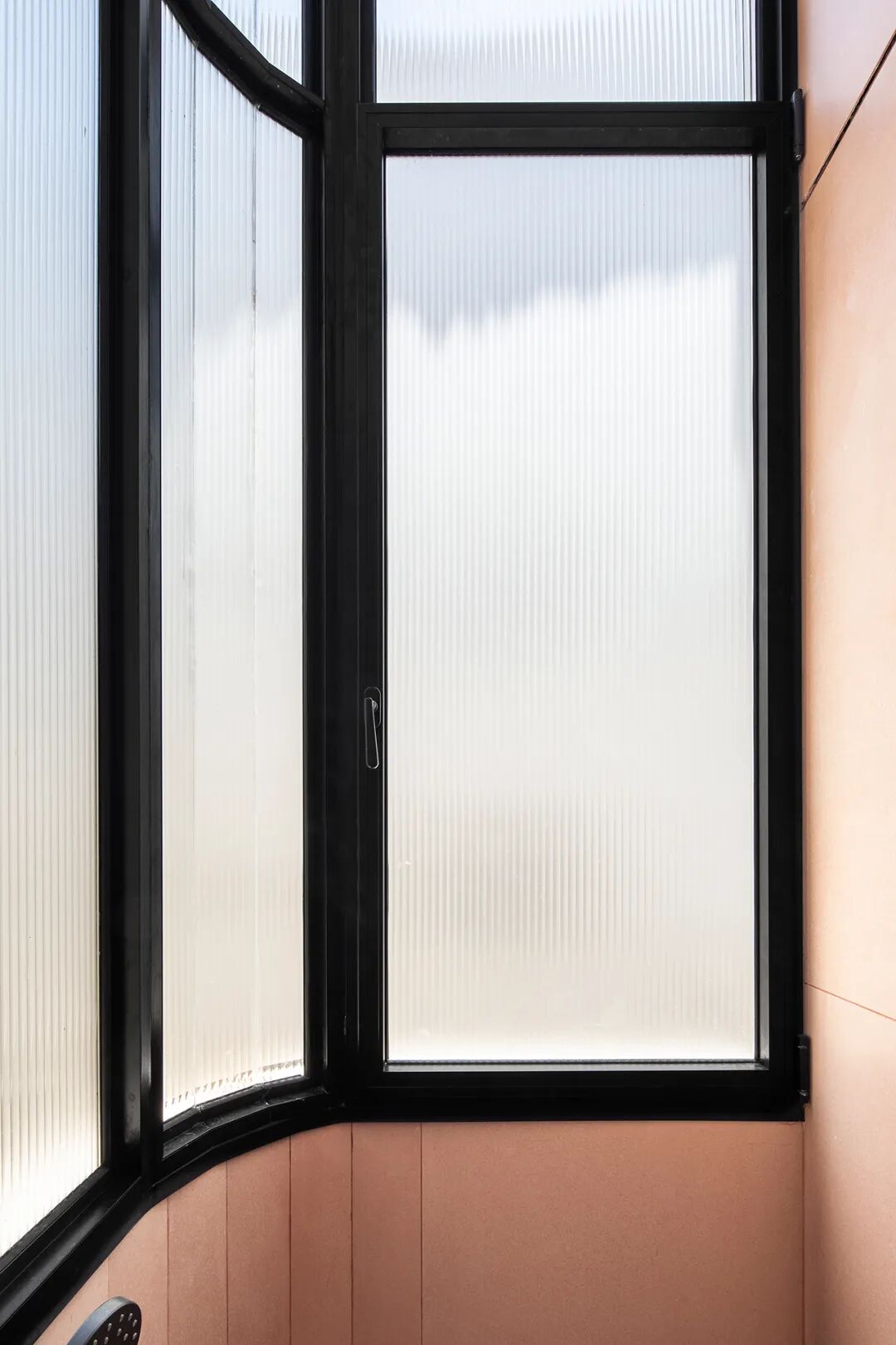 卫生间曾是一个半开放式的阳台, 以前的弧形阳台现在容纳了一个宽敞的淋浴房,大面积的凹槽玻璃窗让自然光充斥其中。