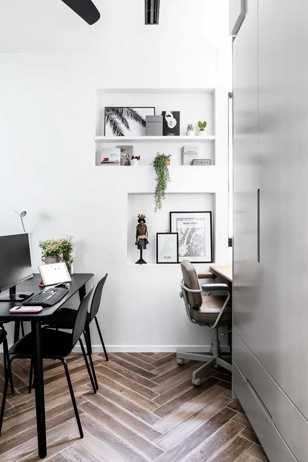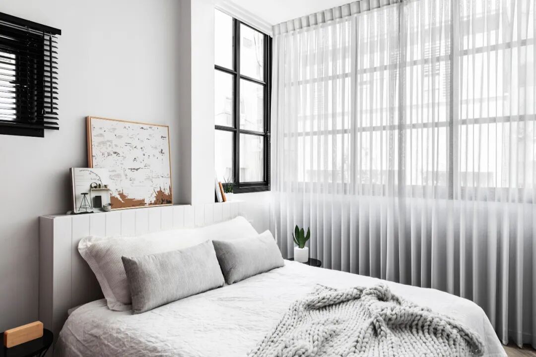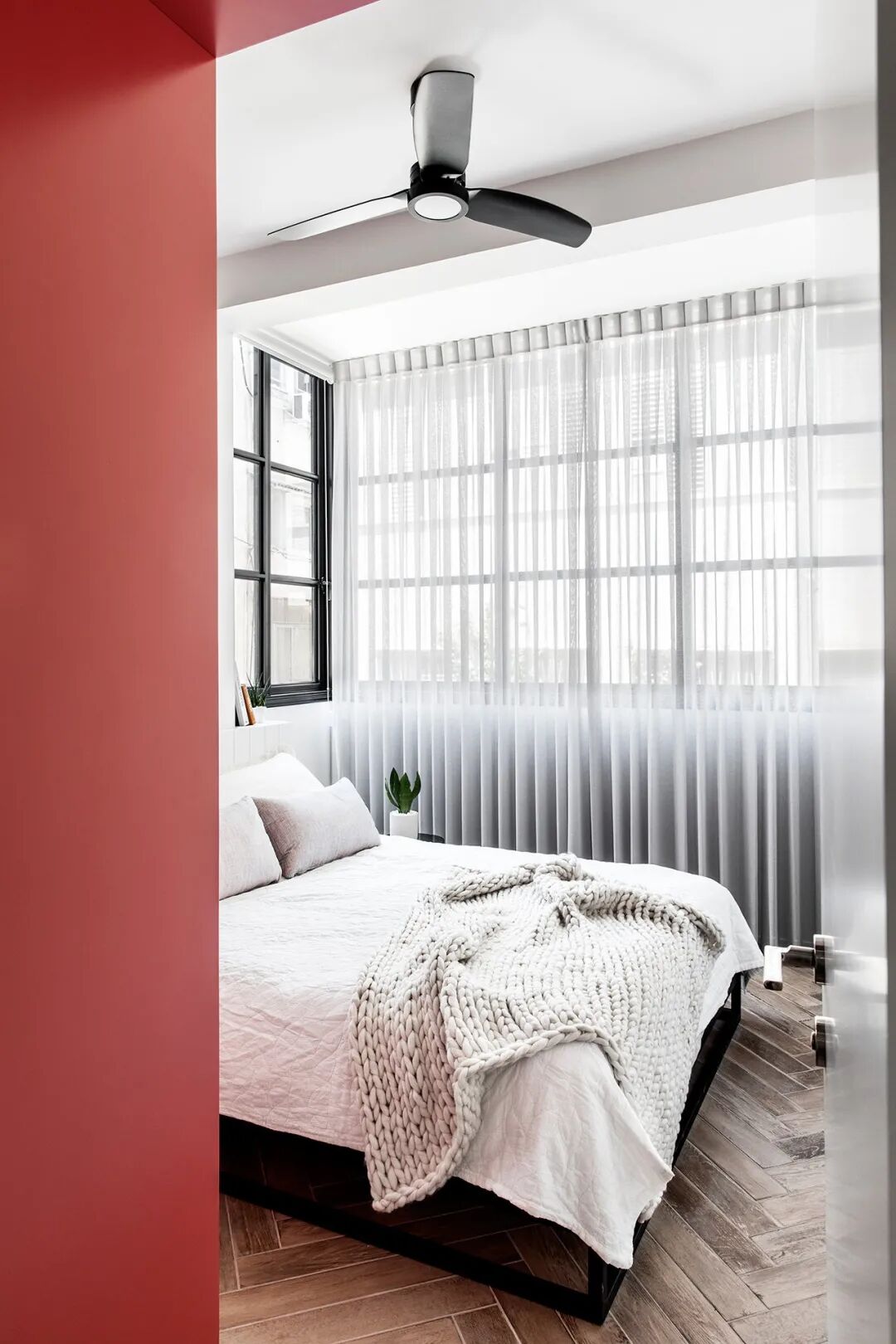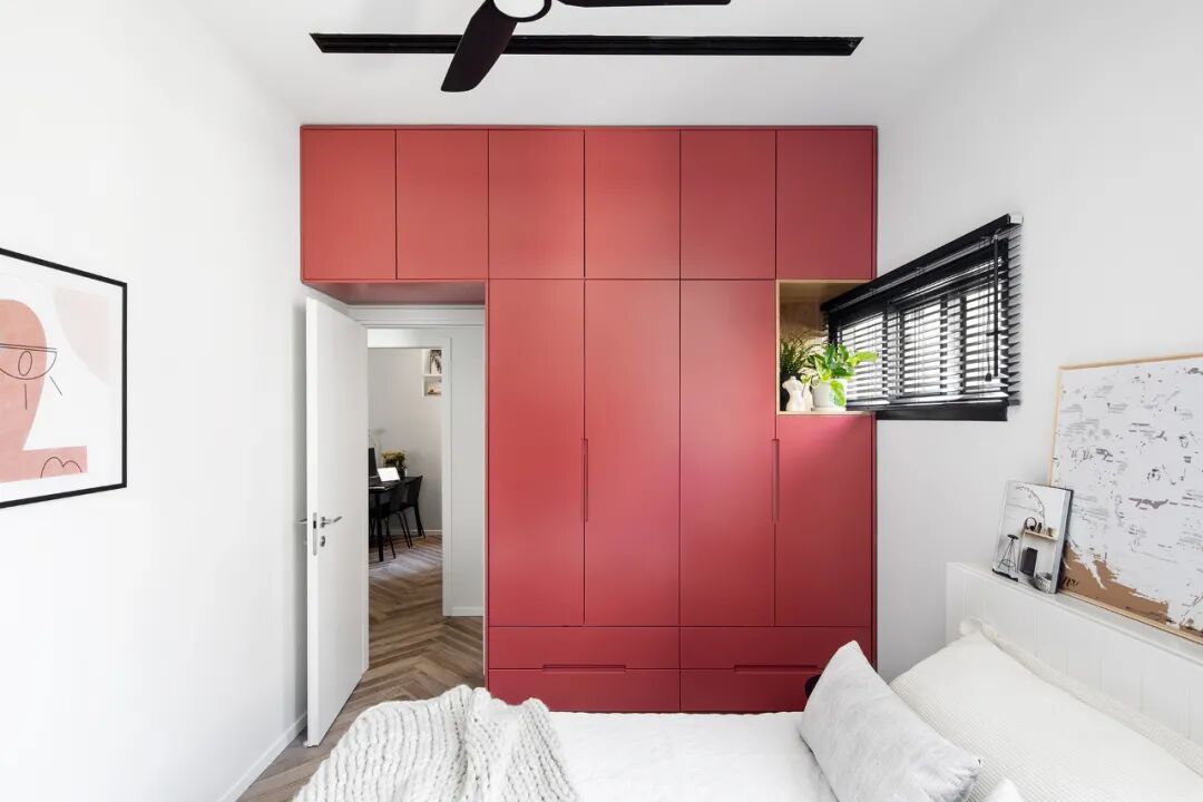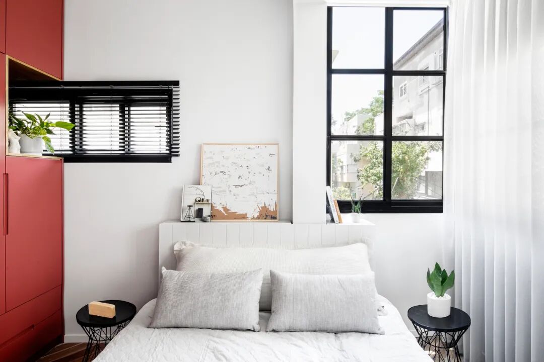 私密空间的卧室也延伸到了原本的阳台空间。原本卧室的窗户被衣柜挡住,所以建筑师在其中设计了一个壁龛,让自然光进入,创造了绿意盎然的小角落。