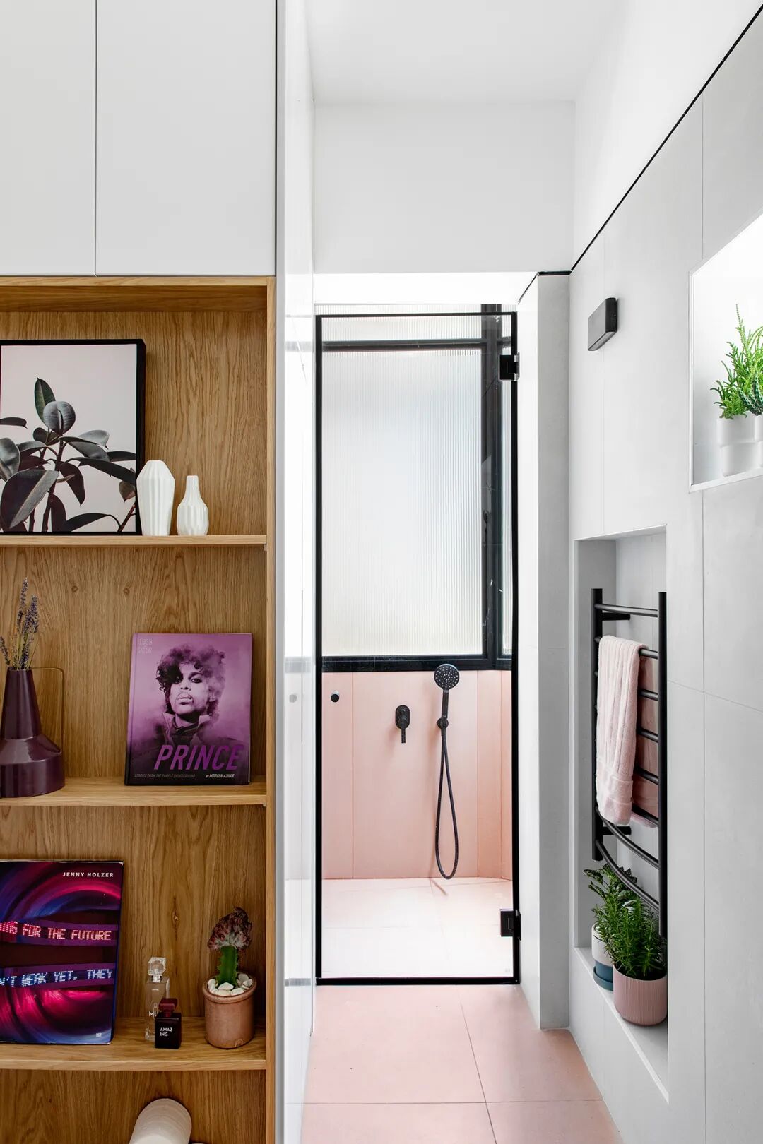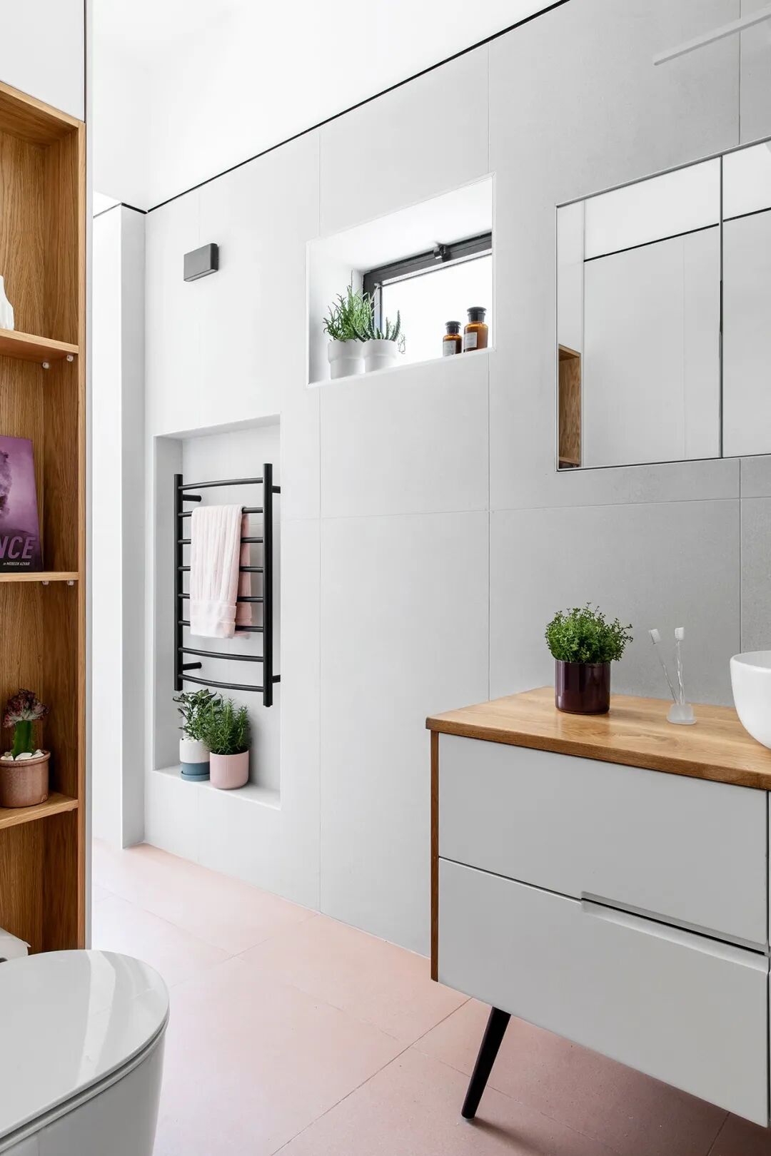 另一端则在马桶旁边设置了开放式的架子,可以放置功能性和装饰性等物品。