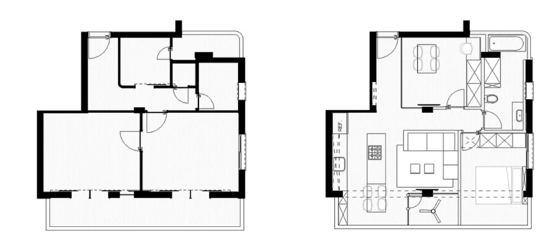 通过整合入口走廊和部分前阳台,创造了一个开放式的起居、用餐和厨房区域,通过使用建筑后部的小阳台扩大了浴室,并将昏暗的厨房变成了一个书房,通过窗户引入了自然光。