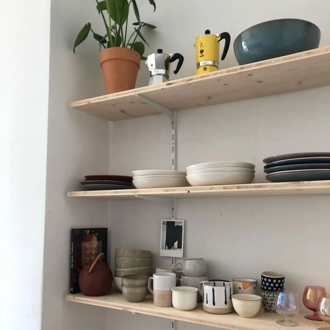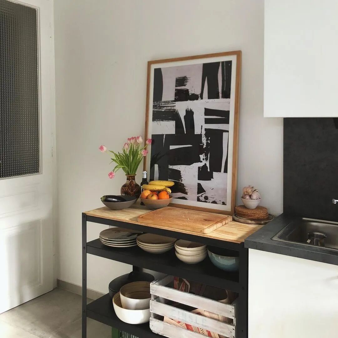 厨房用AA柱搭配三合板,还有黑色金属架等开放式收纳,让餐具成为陈列,宛如艺术品一般彰显着主人的品味。