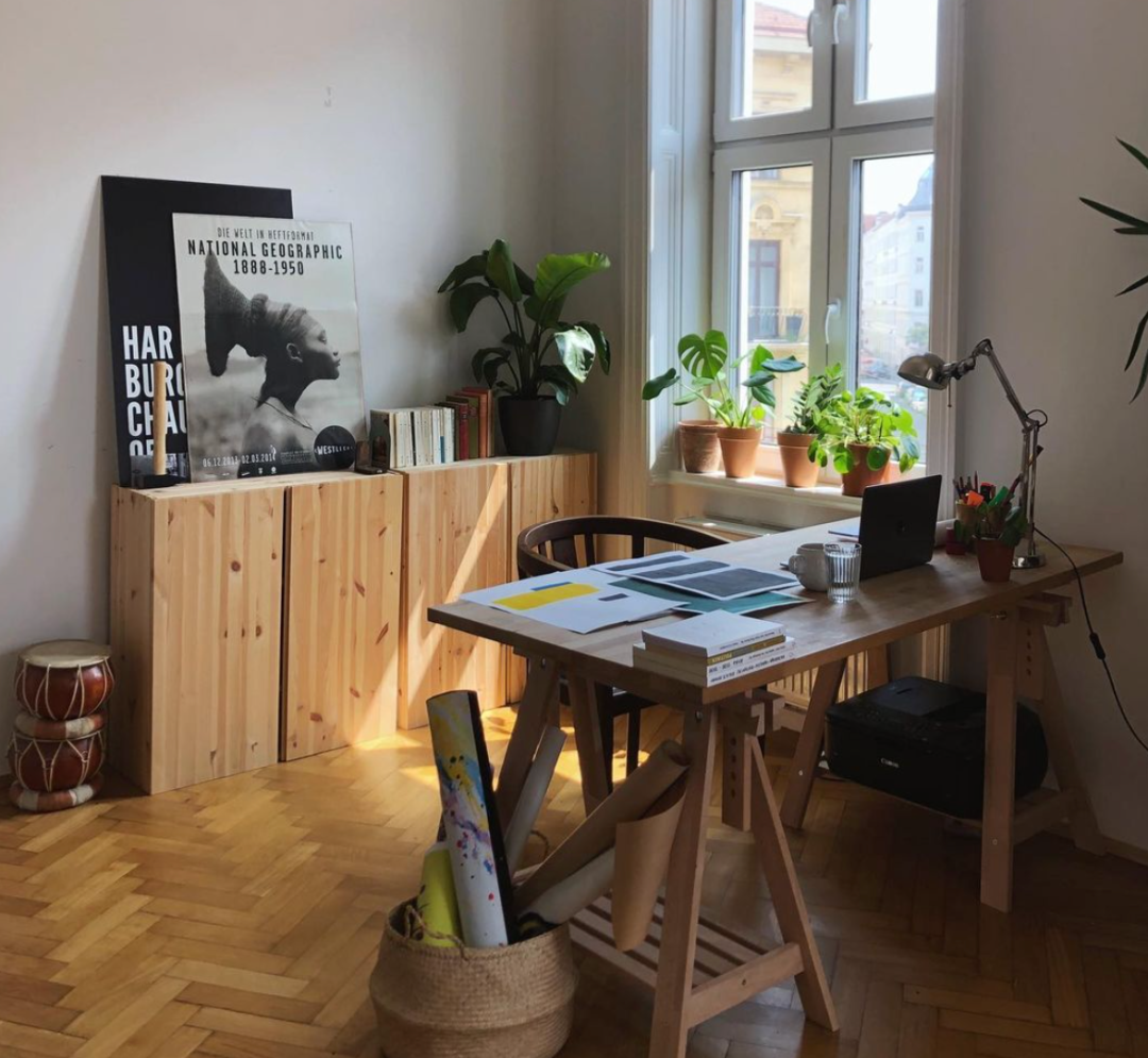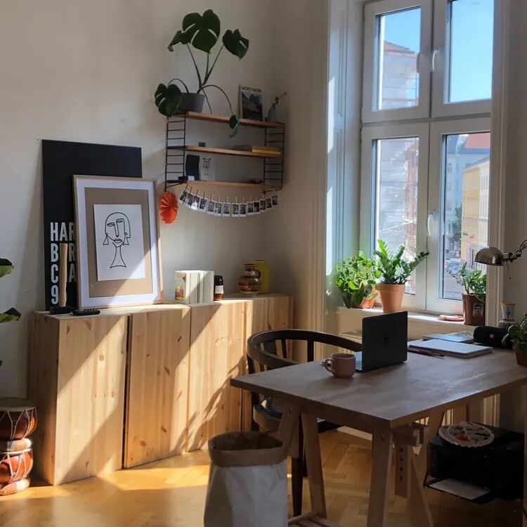办公区延续着客厅的自然气息,木质的书桌和储物柜,用低调的色泽做柔和地低语。