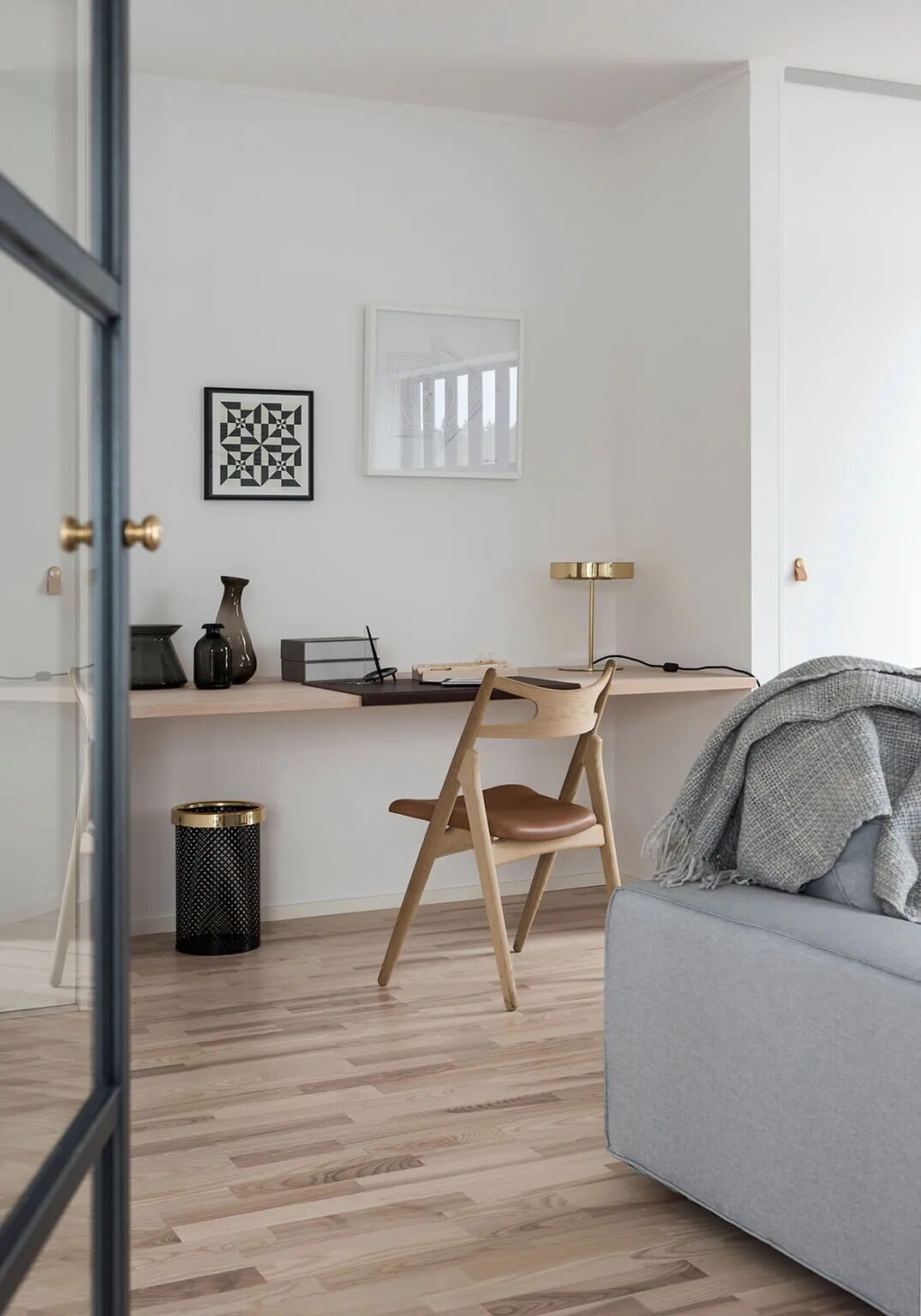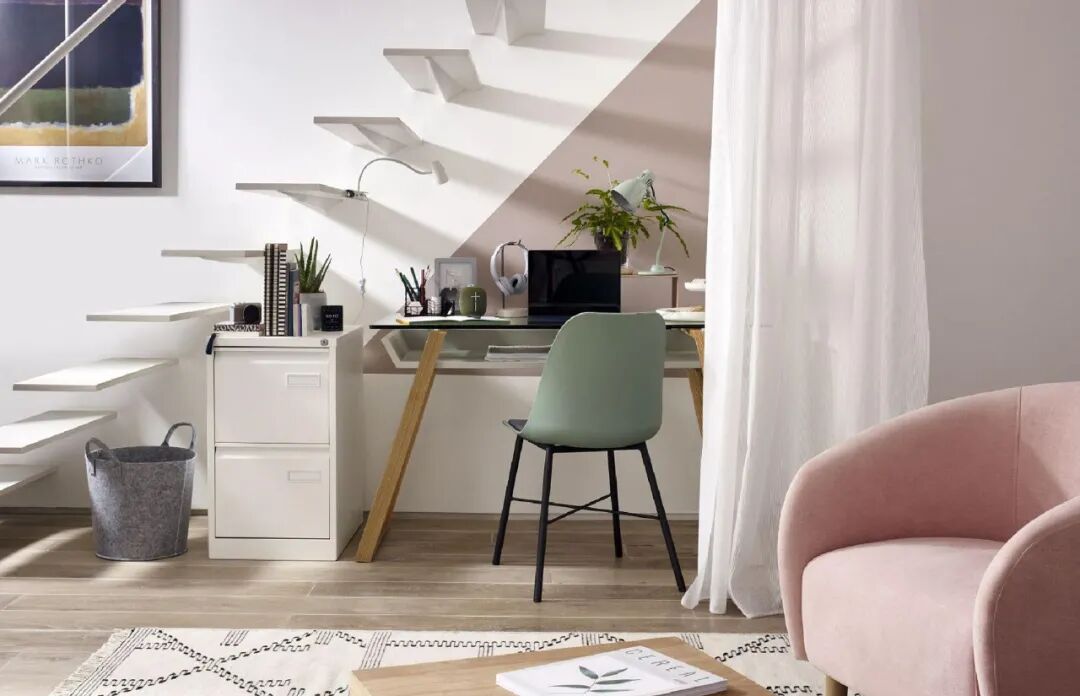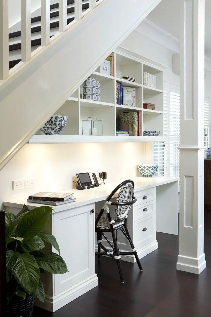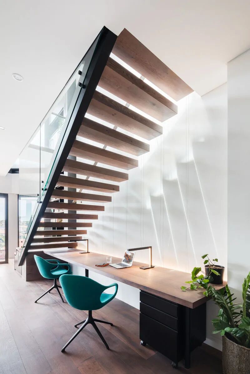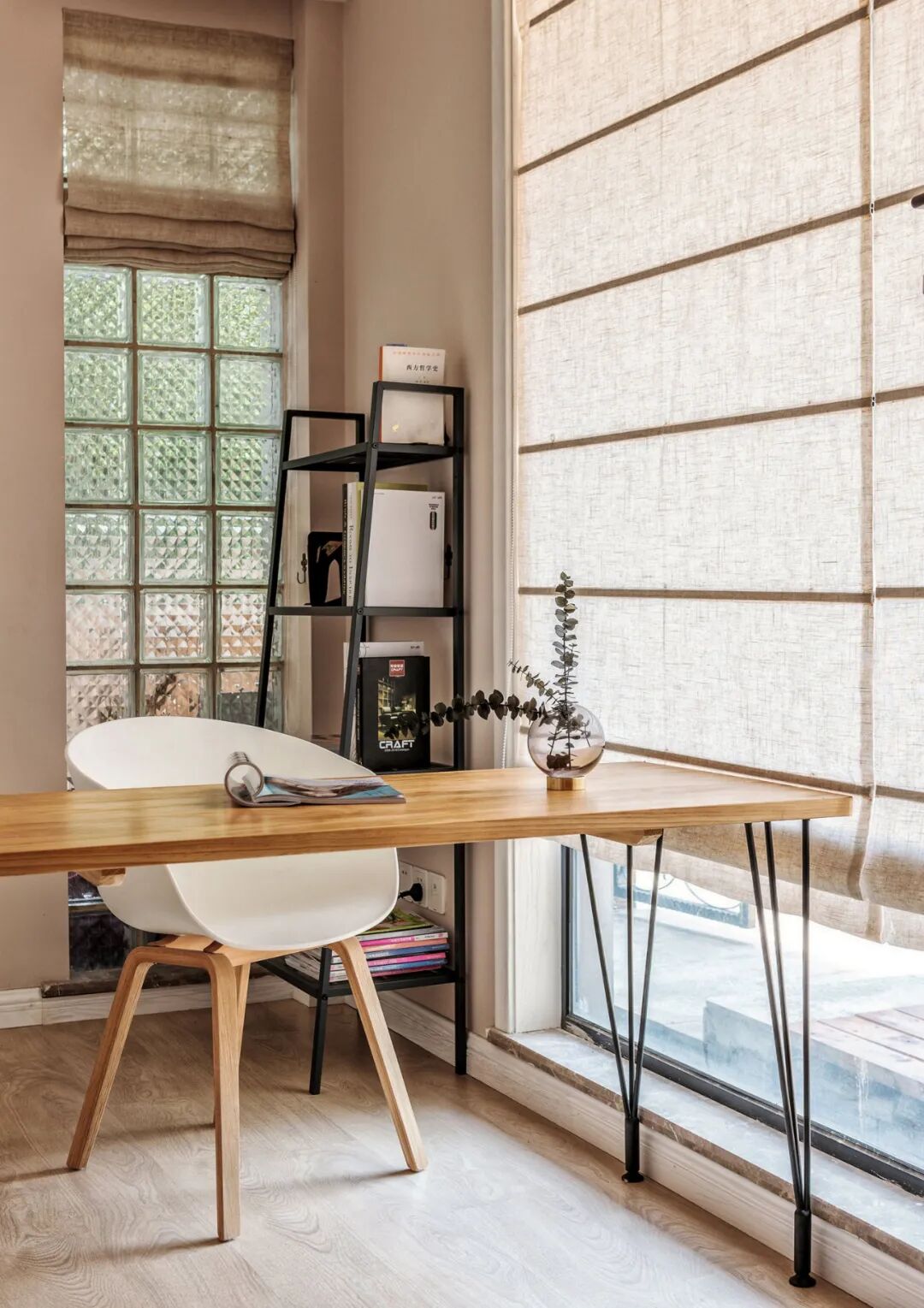 如果你住在复式楼,那么楼梯下方的三角区域也是布置工作区的优选地点。放上办公桌、书架,专属于一个人的半敞开式工作区就完成啦。