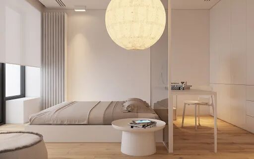 若是卧室里有另一半的存在,不妨在工作区域与床之间设置一堵半透明隔断,在不影响工作和休息的情况下感受到彼此的存在。