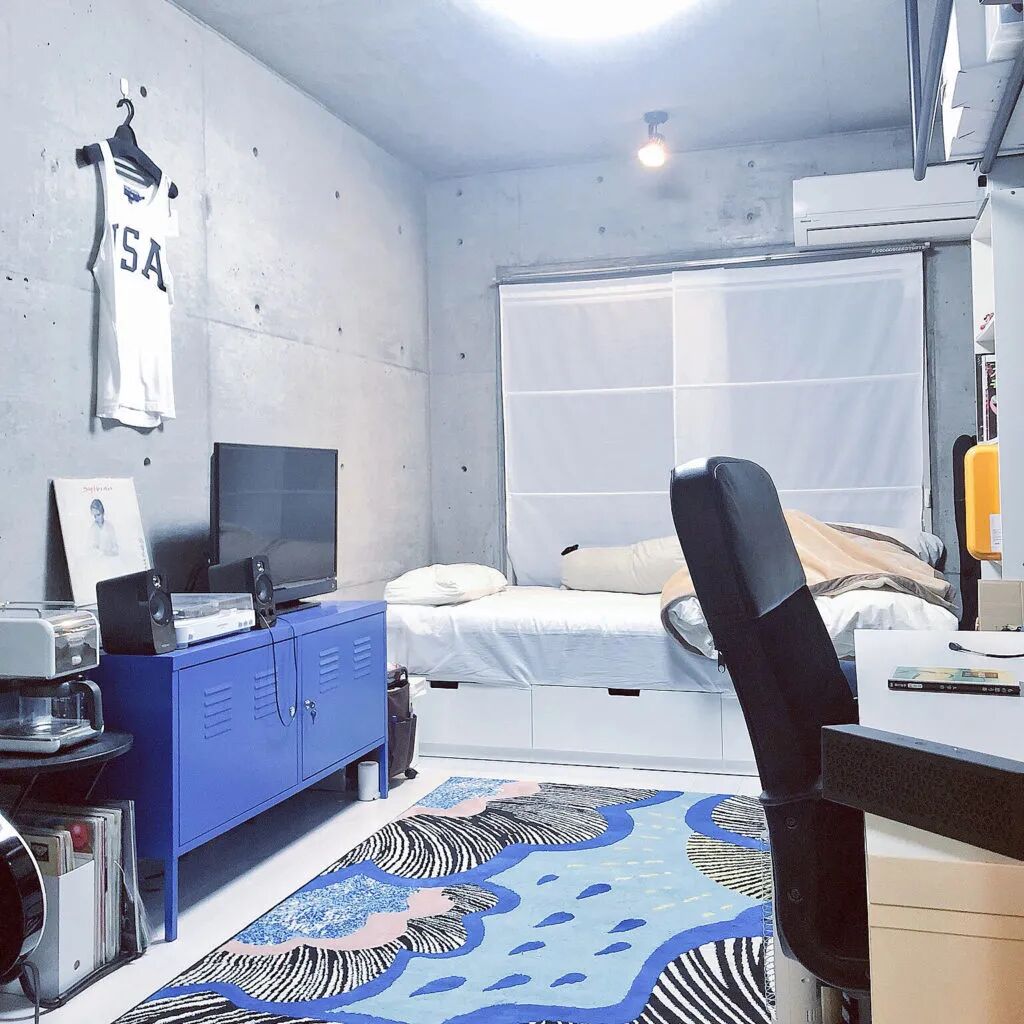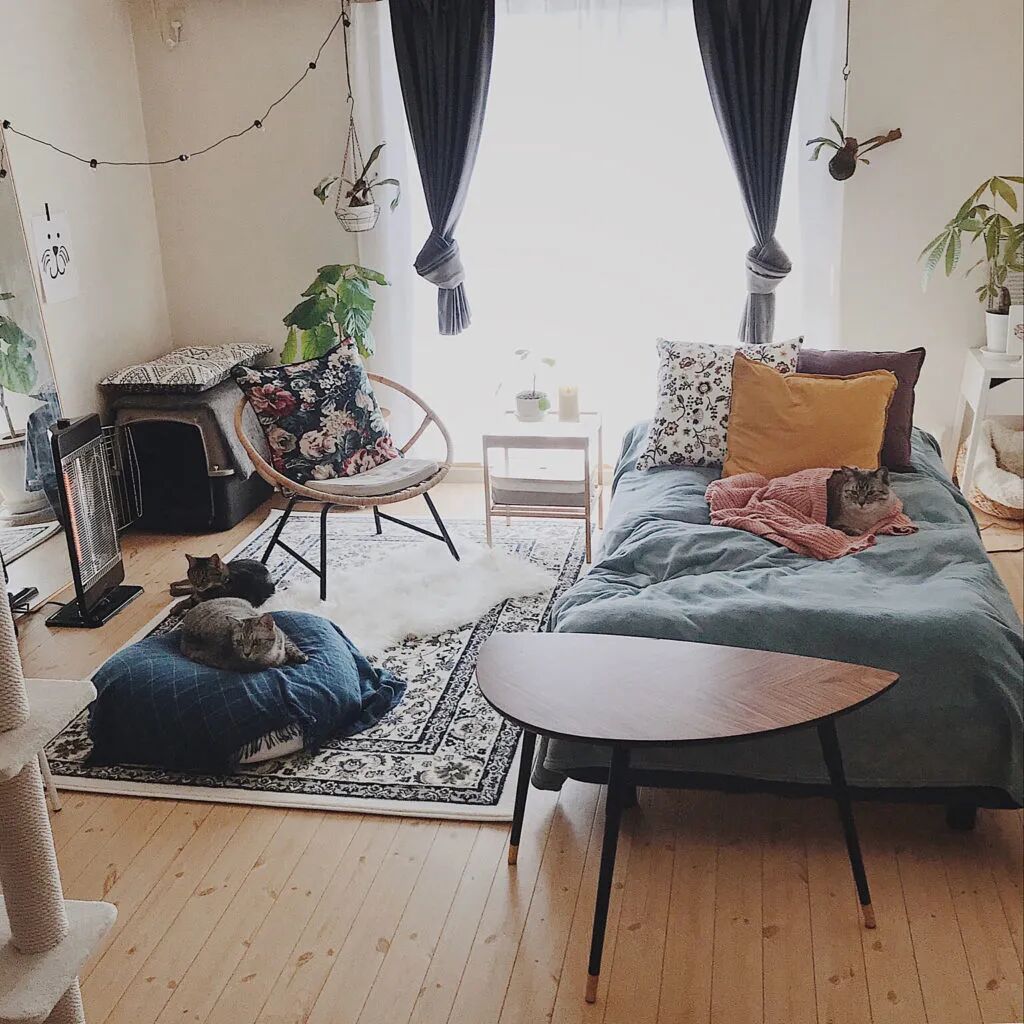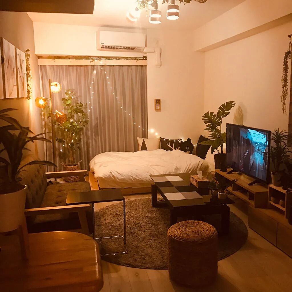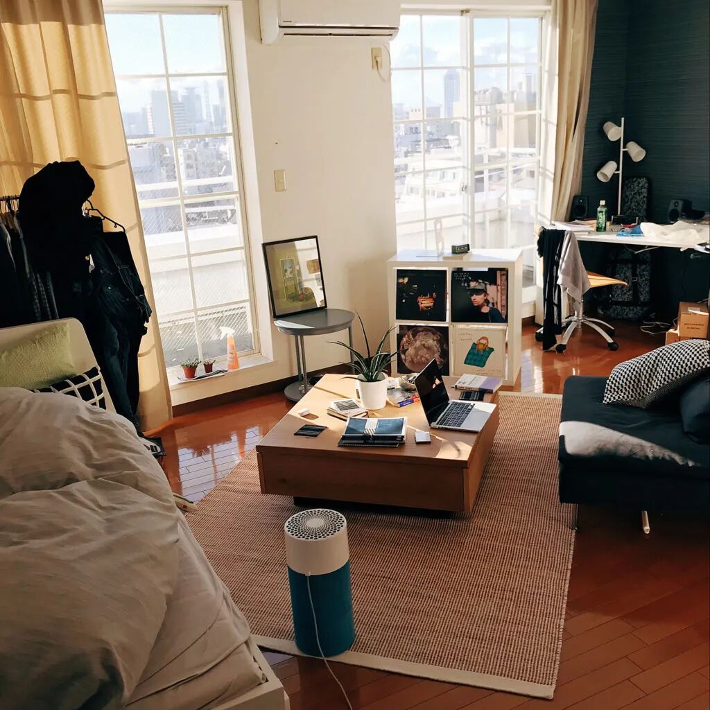 这个超时髦的房间的住户形容这间1R房间的风格是北欧咖啡馆风!虽然一般1R公寓很少有两扇大窗户,但是仍可以从此住户倾斜摆设家具和地毯的角度来启发灵感,窗户前预留空间可视线转向窗户,使房间看起来更加宽敞。