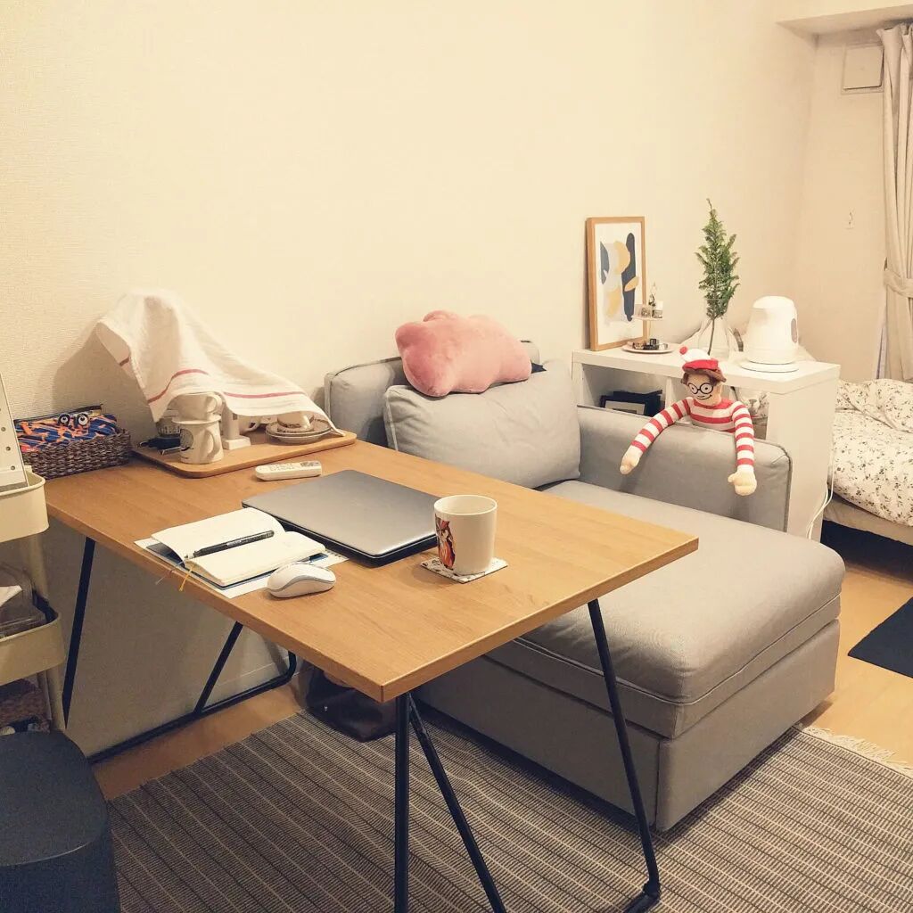 因为客厅和卧室在同一个区域,没有明确的界限,所以小姐姐用一张可以收纳的桌子,在需要的时候可以改变这个区域的用处~
