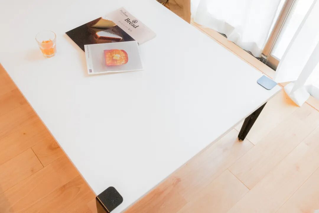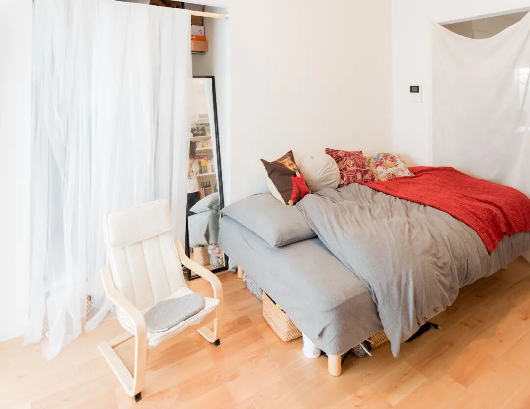 这是一个很棒的多功能空间,将“房间”区隔成卧室和用餐兼工作区。照片中来自无印良品的桌子既是餐桌也是工作用桌子。
