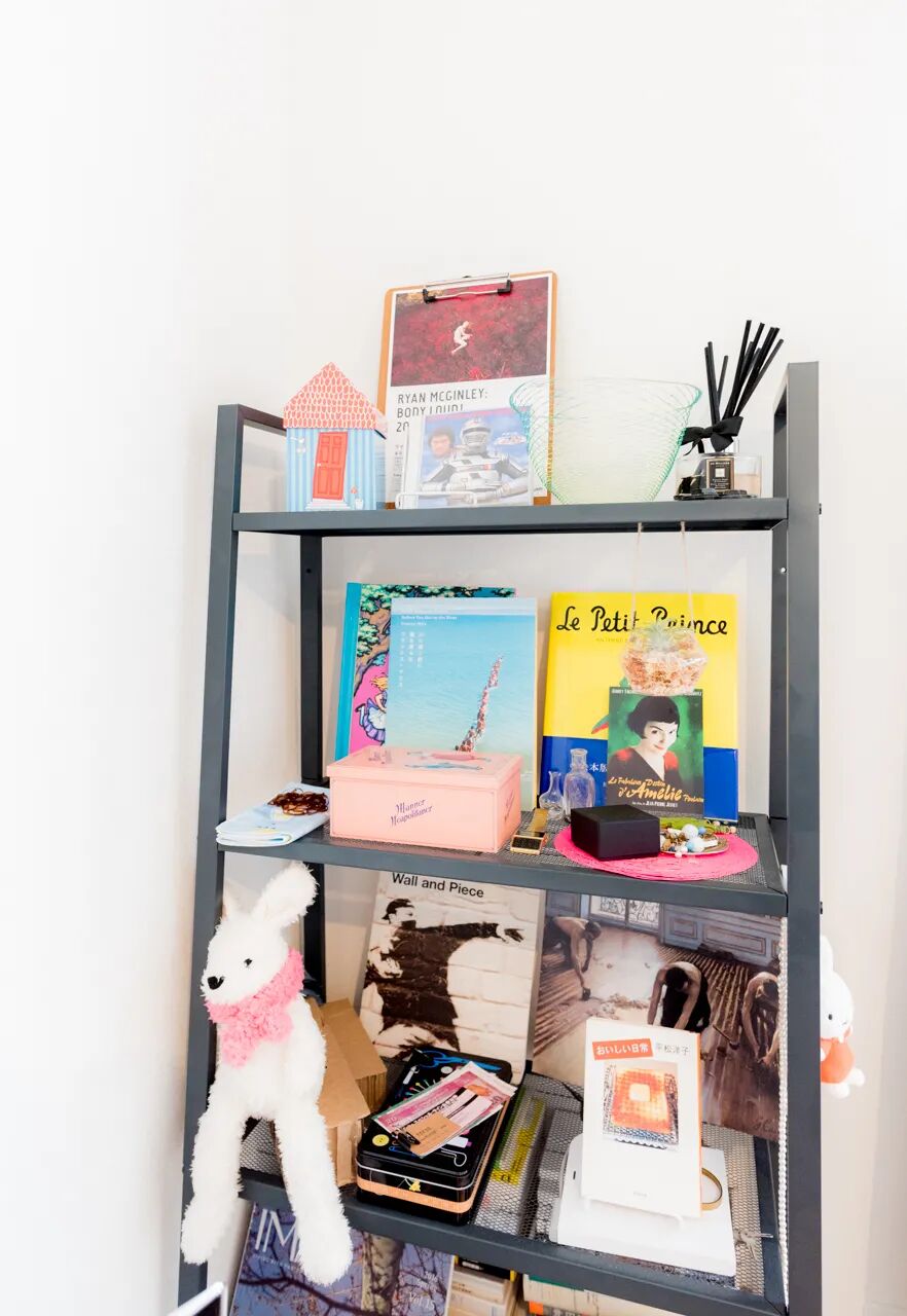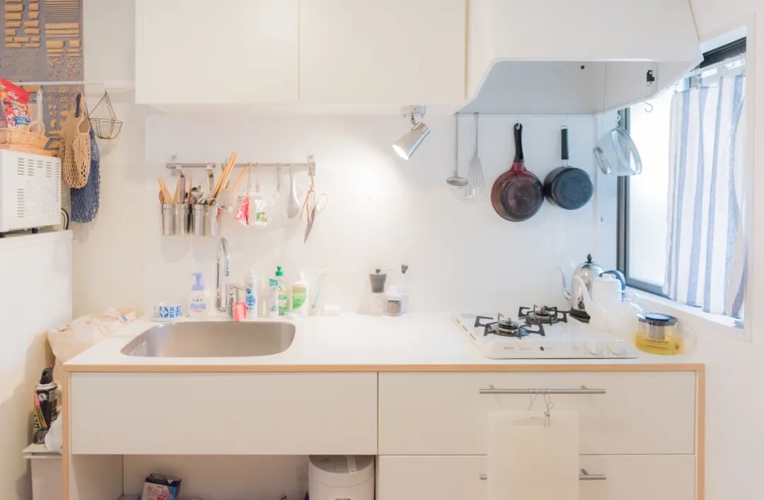 窗帘边上的小架子摆放很多平时经常要使用的物品。再来就是厨房的区域了。小姐姐家是典型的日式开放厨房,使用了很多挂钩,方便又节省空间。