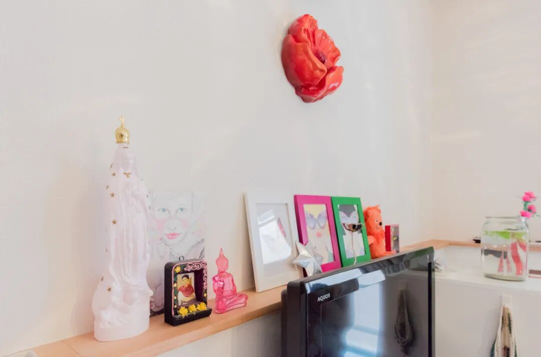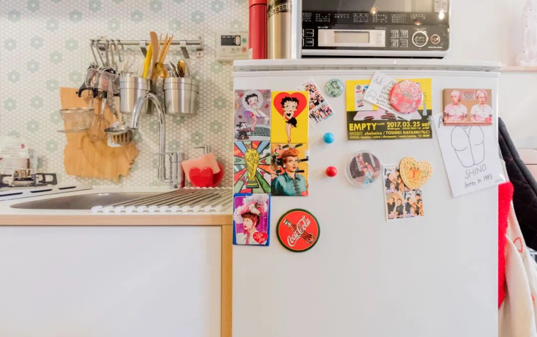 冰箱上贴了很多可爱的贴纸。玄关也贴了很多贴纸。房间里围绕了一圈钉在墙壁上的小架子,在小架子上也摆满了许多丰富多彩的东西。