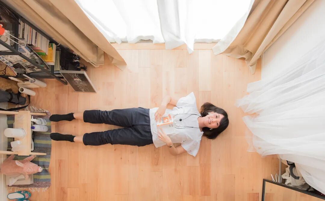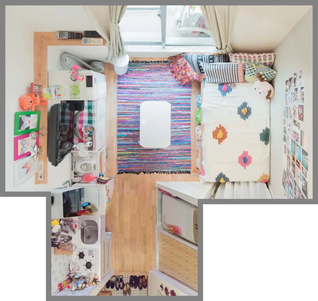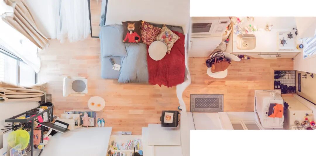 然后我们开始分享第二位小姐姐的房间,从房间的俯视照片来看,这个房间并没有很多物品,但是是一个相当整洁的房间,大小似乎只有10㎡左右,但是布置的很精致!