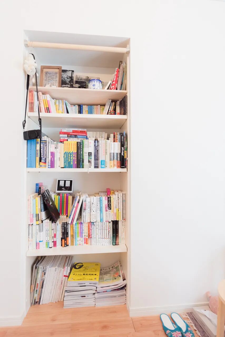 镶嵌式的书架,节省了很多空间,并且可以发现使用了伸缩隔板,大大增加了可收纳的空间,色系和材质让空间看上去也很干净整洁。