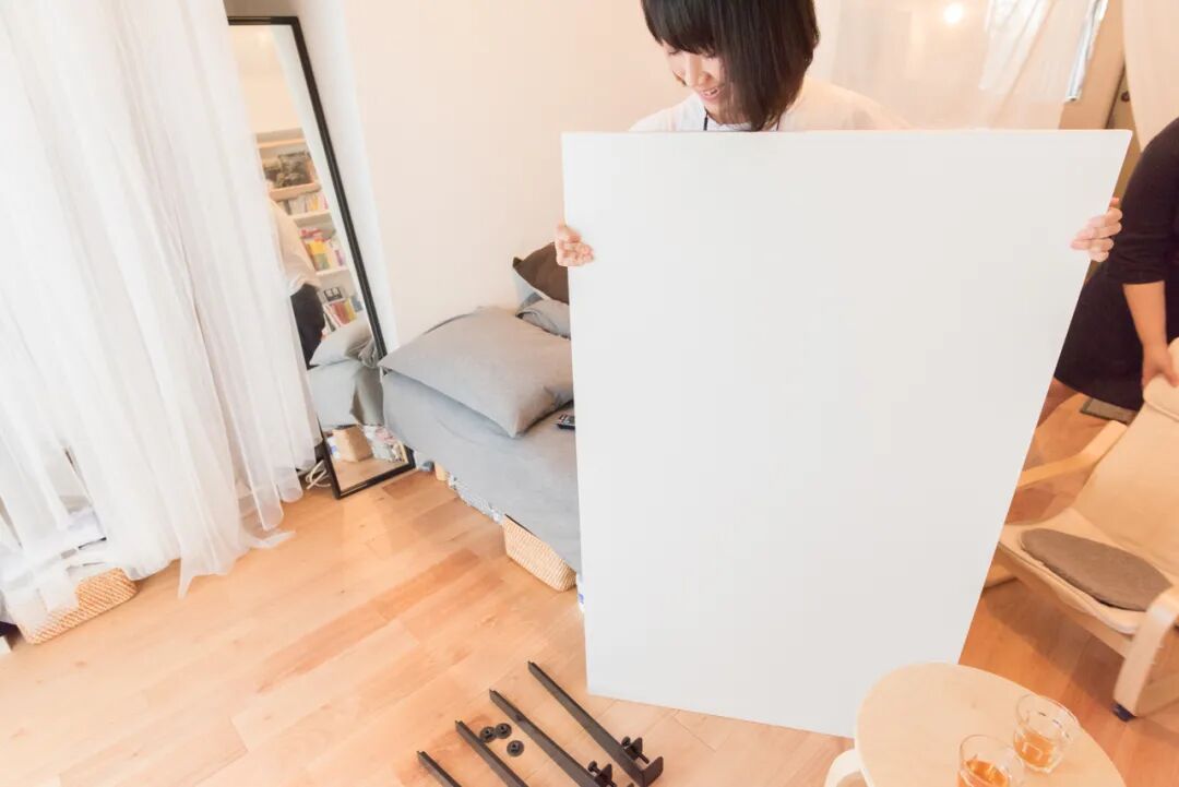 进入房间时,第一印象是隔断用的纱质窗帘。一块纱帘将房间右侧的厨房与左侧的客厅隔开。而且,储藏空间也是用纱帘而不是门隐藏。房间的整体气氛是蓬松的,感觉很好。