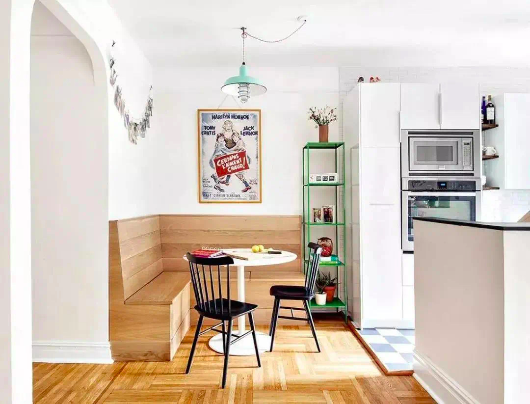 在鸡肋的空间角落打造一个转角卡座,不仅能巧妙改善户型,还能增加储物,盘活死角。