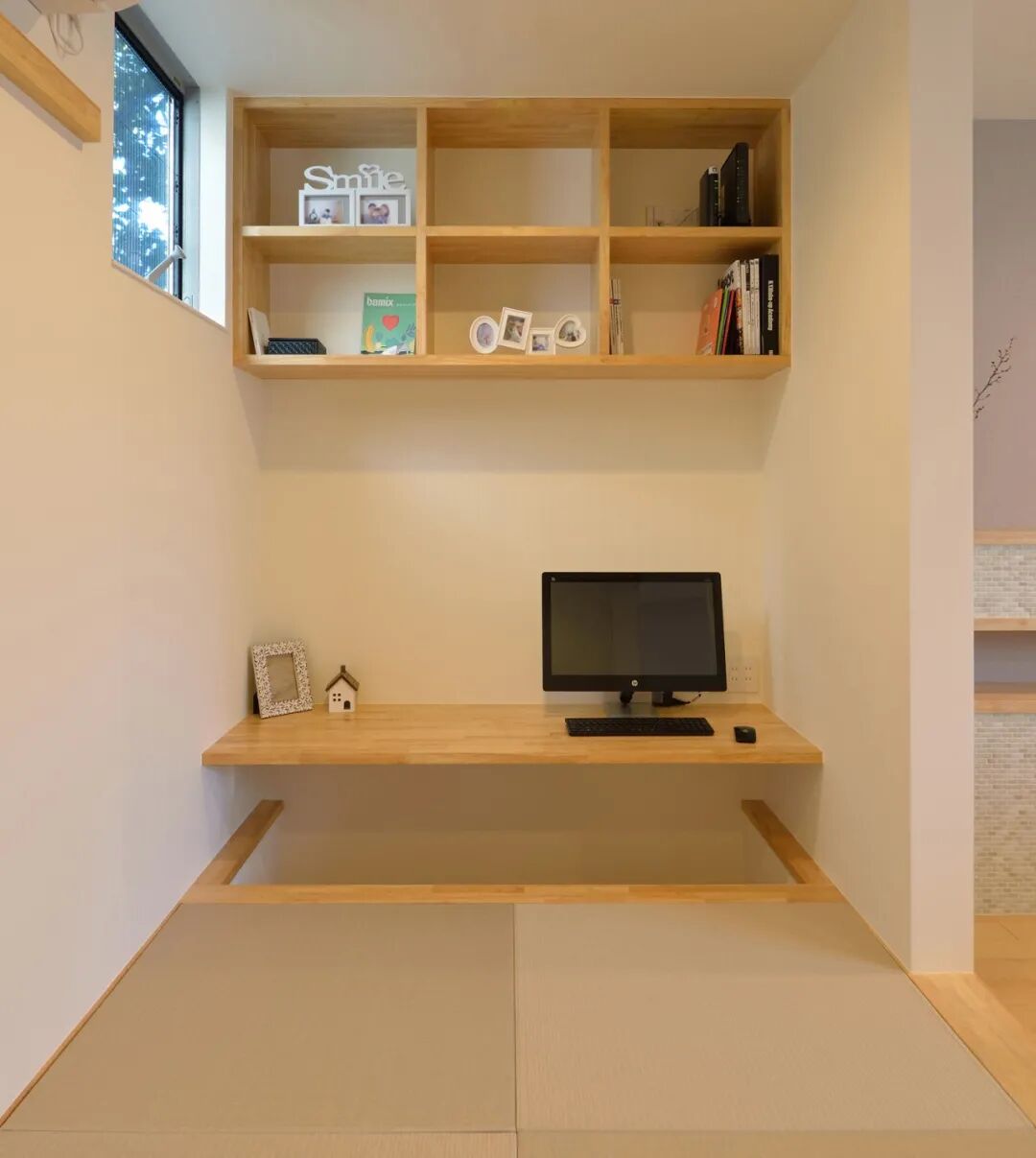 榻榻米搭配悬空桌板也不错,镂空一段面层让腿可以伸直。集放松、学习、家庭办公于一体。