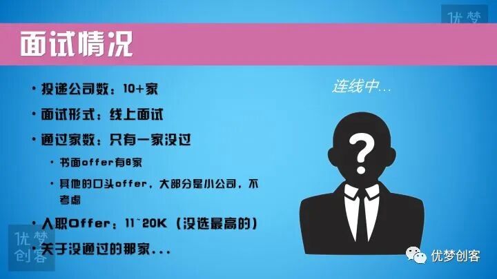 在投简历时,我投了十几家公司,全部都是线上面试。当然这也是和我的个人选择有关,我不太能接受现场面试,因为现场面试要大老远跑一趟,花在路程上的时间也非常多
