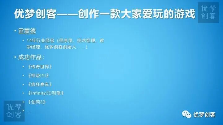我是今天课程的主讲老师雷蒙德。在行业内有14年的从业经验,做过程序员,技术经理,教学经理,目前的是我们优梦创客的创始人