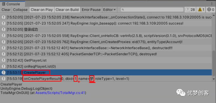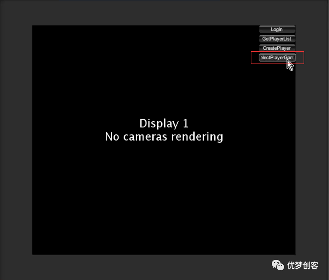 点击Game窗口右上角的第三个按钮创建角色,创建角色时客户端会向服务器提出创建角色请求,服务器会给客户端返回一个结果