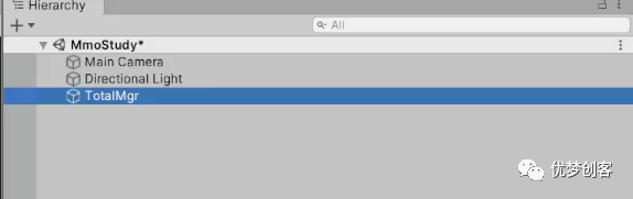 在Unity场景里创建一个空对象,名叫TotaMgr,也就是总管(如下图)