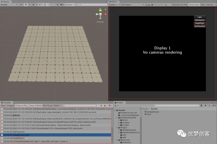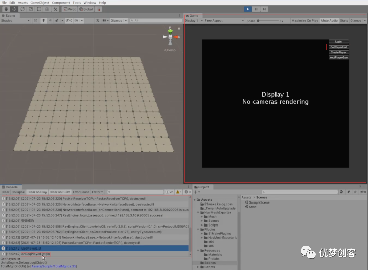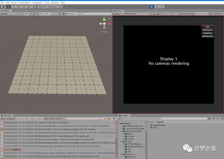 这是我们的Demo场景,在游戏运行时游戏的服务器也会同步运行,点击Game窗口右上角的Login按钮时会使用默认的账号密码登陆并打印日志信息