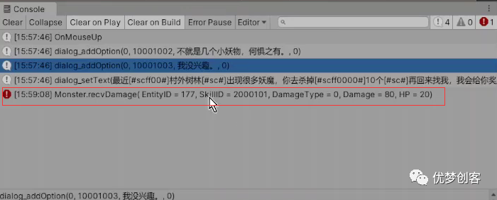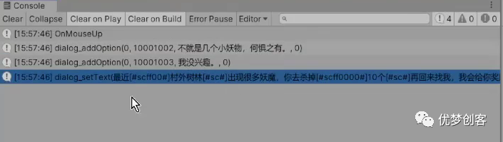 通过使用鼠标点击NPC可以触发对话并打印到控制台,之后我们会使用Unity的UGUI来把NPC的对话和对话选项显示到客户端的窗口上