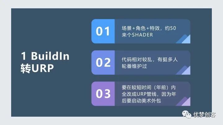 需要在较短的时间内全面完成URP管线的改造,为什么?因为在年后有一轮美术外包的启动,美术外包一旦启动,就没办法再去修改Shader了,因为美术资源一旦做完,再去修改的话就会额外的增加时间和工作量