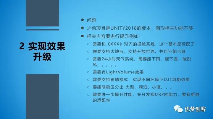 因为原先项目的版本做了一次引擎升级,虽然说引擎升级了,但是它的图形还是几年前的标准,所以新项目需要进行品质提升的,这里也包括一些问题: