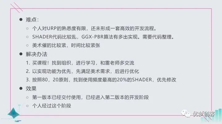我们TA在工作过程中,永远是以效果实现为最优先的,你一定要确保效果能达到美术和制作人的要求。之后再考虑性能的问题