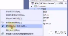 接下来我们需要为项目引入WebSocket库,刚才创建的三个项目里都要引入,这里我用为Common引入WebSocket库为例子,来为大家演示引入过程:在Common项目的依赖项上右键,点击管理NuGet程序包