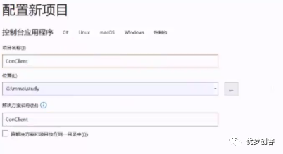 下面再用与建立服务器项目一样的方法建立客户端项目,只是将项目名称改为ConClient