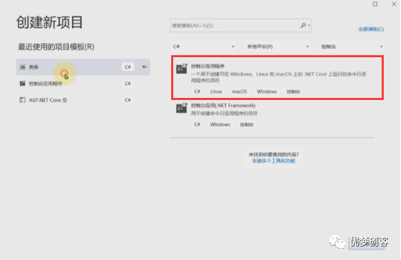 VisualStudio有很多种控制台,比如基于.NET Framework或.NET Code的,本文使用的控制台为下图中被标记的控制台