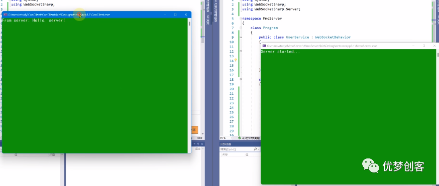 using System;using WebSocketSharp.Server;using WebSocketSharp;namespace MmoServer{ class Program { // 这个是我创建的用户相关的服务 public class UserService : WebSocketBehavior { // 提供服务 protected override void OnMessage(MessageEventArgs e) { this.Send($"From server: {e.Data}"); // 收到消息时向客户端发送消息 } } static void Main(string[] args) { WebSocketServer svr = new WebSocketServer("ws://localhost:8888"); // 建立一个服务器,并让它监听8888端口 svr.AddWebSocketService<UserService>("/UserService"); // 为服务器增加一个用户服务 svr.Start(); // 启动服务器 Console.WriteLine("Server started..."); // 在控制台输出Server started... Console.ReadLine(); // 等待用户敲回车 svr.Stop(); // 停止服务器 Console.WriteLine("Server stopped"); // 在控制台输出Server stopped... } }}