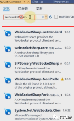 在弹出界面中搜索WebSocketSharp,然后选择搜索结果中的第一个进行安装,这样就成功引入WebSocket通信库了