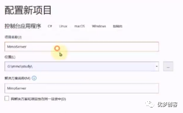 因为我们先建立的是服务器项目,所以项目名叫做MmoServer,配置完成后点击下一步,其他信息中的目标框架选择默认就好,然后点击创建