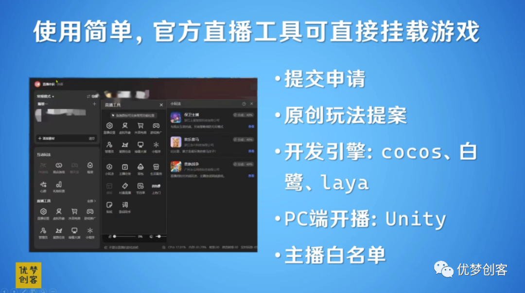 如果使用的是这种传统的开发引擎进行开发,那么游戏上架以后就会出现在小玩法里面。而如果使用unity的话,因为unity引擎本身是一个体量比较大的游戏引擎,能做到的游戏效果会相对好些。所以不是直接出现小玩法中,而是通过在PC端进行画面的投屏,把unity的游戏画面进行投屏来进行开播。