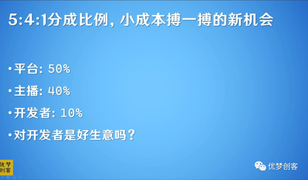 直播游戏的分成比例是5比4比1,平台拿50%,主播40%,开发者10%。