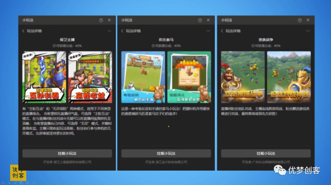 看上去开发者分到的比例是比较小的,但是开发者可以去把一个游戏上架到多个直播平台。从目前平台支持的游戏来看,游戏大多数可以归类为玩法简单的,品质一般的范畴,非常适合小团队个人开发者去开发。