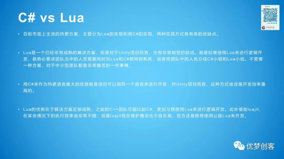 Lua的优势在于解决方案足够成熟,也有很多开发者比起C#作为热更语言,更加熟悉Lua开发。而且借助luajit,在某些情况下的执行效率会非常不错,不过luajit现在的维护情况也不容乐观,对开发者的要求比较高,所以官方还是推荐使用公版Lua进行开发