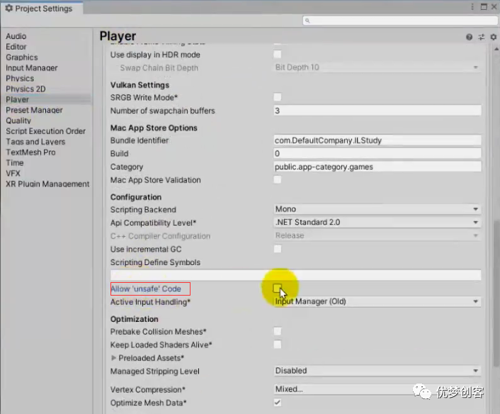 点击Player,在右边OtherSetting下找到Allow unsafe Code这一项,打上勾,报错就消失了。这是让Unity允许使用不安全的代码