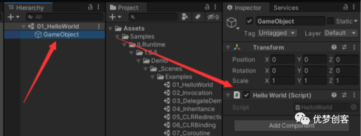 场景内GameObject上有个脚本HelloWorld,点击打开