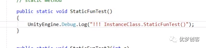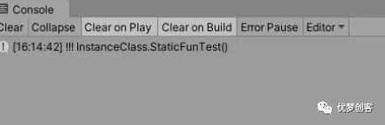 里面只有一个语句意思是:输出”!!!InstanceClass.StaticFunTest()”。这就是我们刚刚在运行Unity时在Consle面板输出的文字