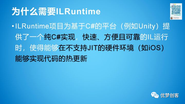 ILRuntime也可以在不支持JIT的硬件环境下进行代码的热更新。例如IOS环境出于安全考虑不允许在程序运行期间动态加载一块程序代码到内存中运行,所以使用ILRuntime或XLua可以实现代码的热更新