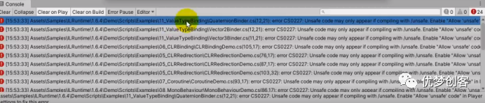 导入成功之后会发现Console窗口报错了,这是因为导入的Demo中写了不安全的代码导致的