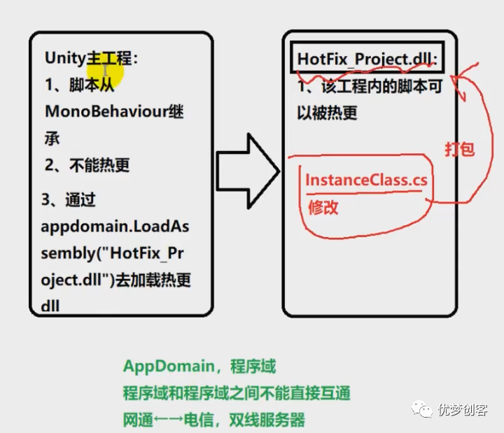通过上面的代码解析我们已经了解到,Unity主工程可以通过appdomain.LoadAssemblyPreobject.dll”)去加载热更新dll。我们可以把Unity主工程和HotFix_Project.dll叫做两个程序域(AppDomain)。程序域和程序域之间是不能互通的