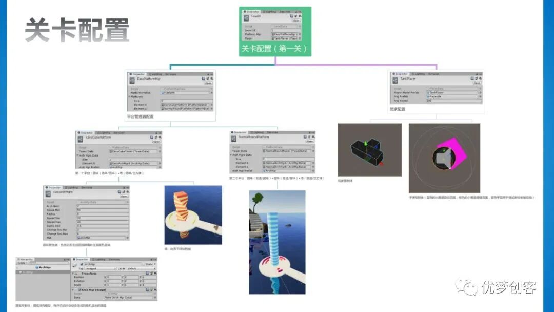 关卡由平台管理器构成,每一个平台管理器管理一到两个平台,每个平台又是由圆环管理器和砖塔管理器构成的,砖塔管理器管理所有砖塔,而圆环管理器管理所有的圆弧