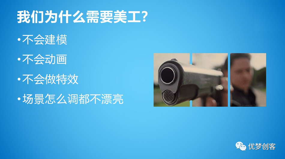 可以自己学一点简单的美工技术,自己能掌握一些美术技巧也会有一些好处,比如可以自己对游戏的玩法进行验证,可以自己创建简单的模型来验证玩法